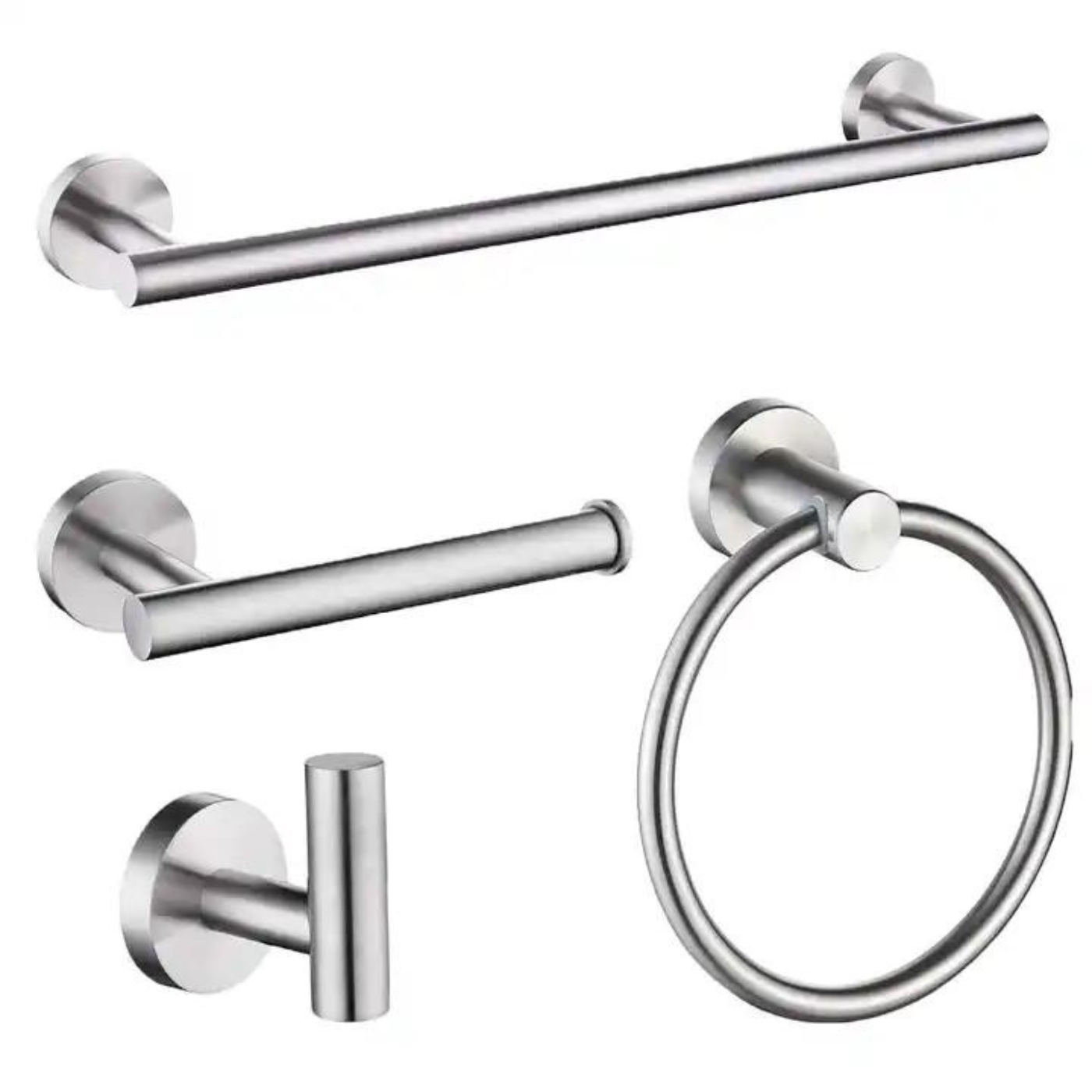 O kit de banheiro 4 peças é fabricado em metal e possui acabamento fosco/escovado. Com excelente qualidade e durabilidade ele proporcionará um ótimo acabamento ao seu banheiro e deixará seu uso ao banheiro mais prático. No kit possui 1 toalheiro reto, 1 toalheiro de argola, 1 papeleira e 1 gancho multi-uso.